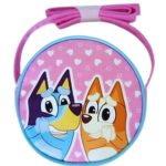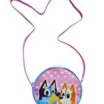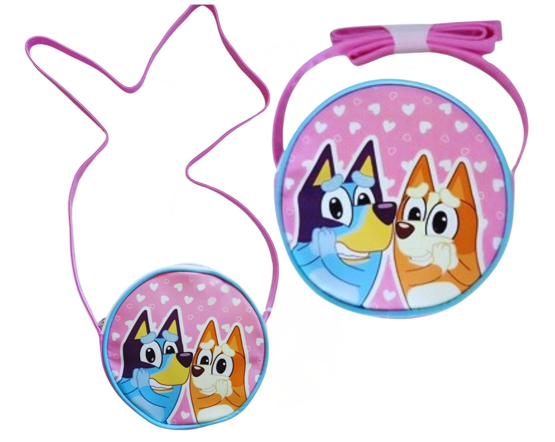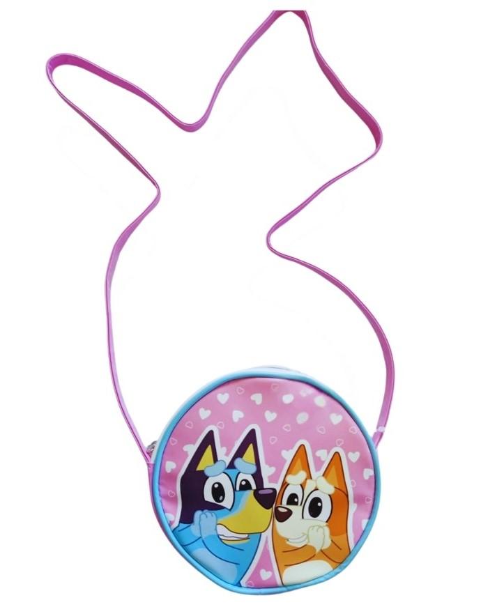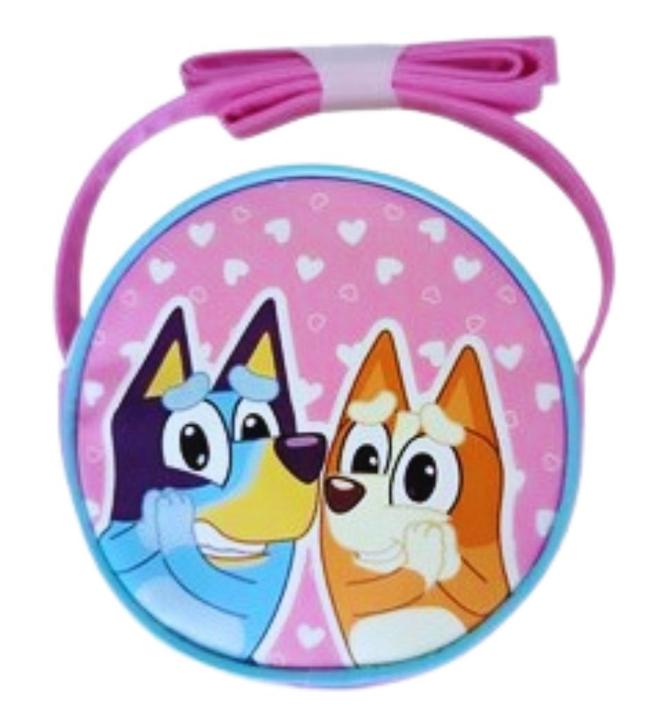 Dětská kulatá kabelka přes rameno s motivem postaviček Bluey a Bingo z populárního animovaného seriálu Bluey.